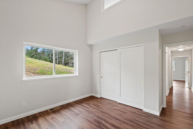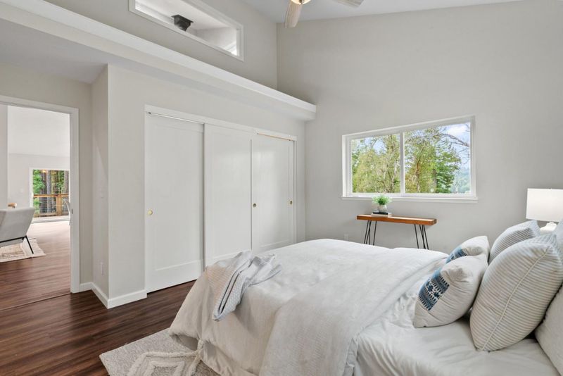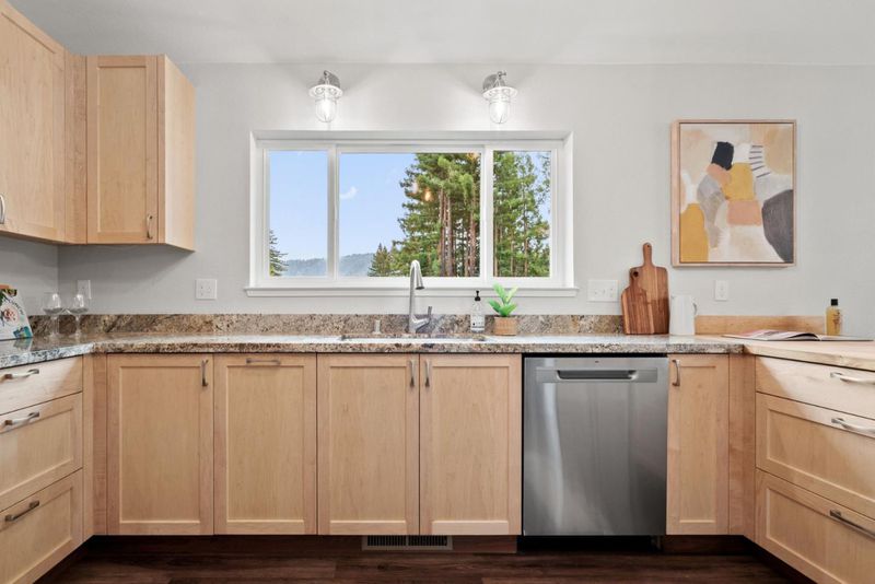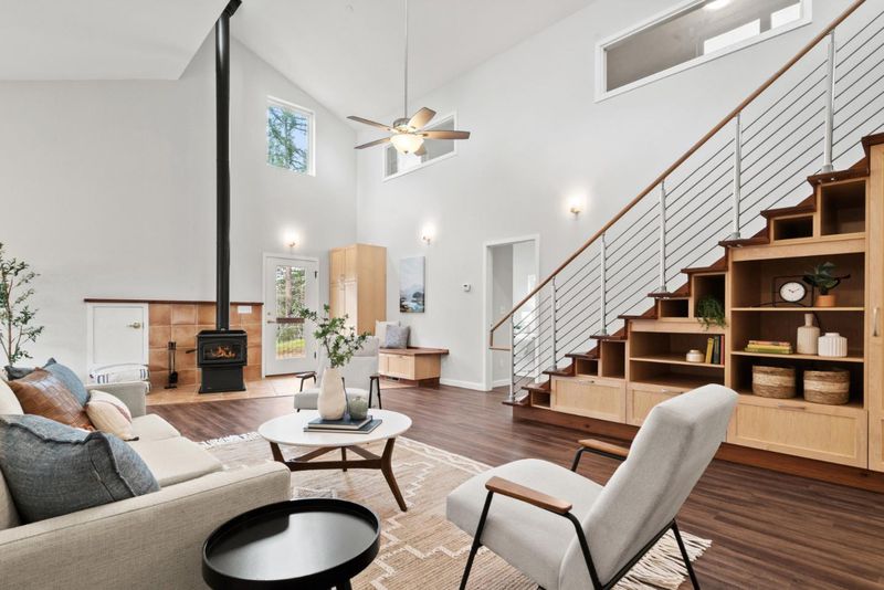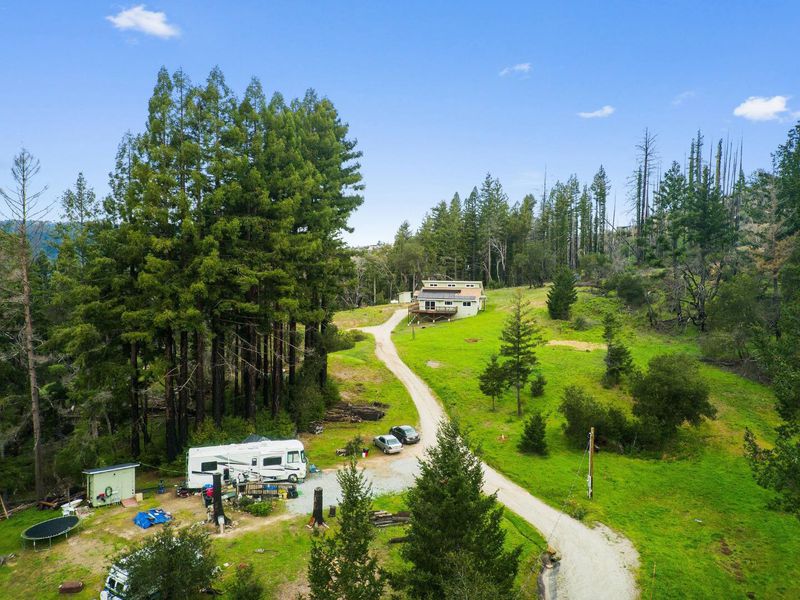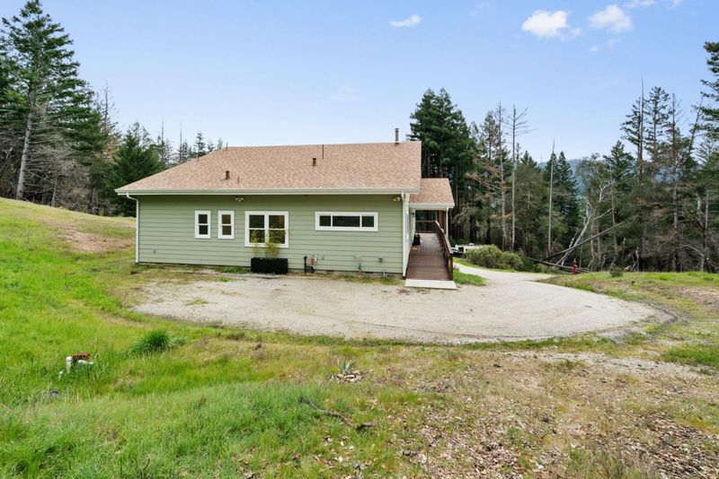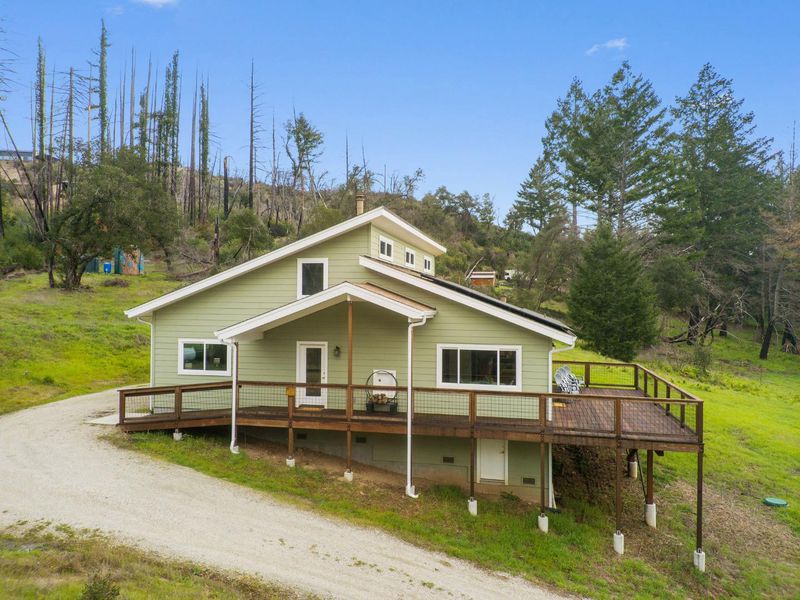 Come see this 2023 custom designed peaceful retreat on 5.5+ sunny acres at the end of a quiet road. Lots of usable land, expansive skies, and privacy. The land is a blank canvas, zoned SU allowing a wide range of uses, including livestock. Inside, the great room impresses with 20-foot vaulted ceilings, a cozy woodstove, central heat, and a striking custom staircase with owner-built cabinetry inspired by Japanese Tansu design. The home lives primarily as a single level, with a versatile 250 sq ft loft and bonus attic. Clerestory windows fill the great room, two bedrooms and the attic with natural light! Every window frames views of sunny hillsides, distant mountains, redwoods, oaks, and a meadow. The kitchen features custom maple cabinetry with soft-close hardware, granite countertops, a butcher block peninsula, and stainless appliances including propane range and hood. The primary suite enjoys sunset views and a spa-like en-suite with dual shower heads, a double-ended claw foot tub, and private commode. Fully functional permitted RV site. South facing solar production reduces power costs. Don't miss the standing-height basement's potential. High-speed internet, and just 10 minutes drive to charming Boulder Creek, +/- 40 minutes to Silicon Valley or Santa Cruz.