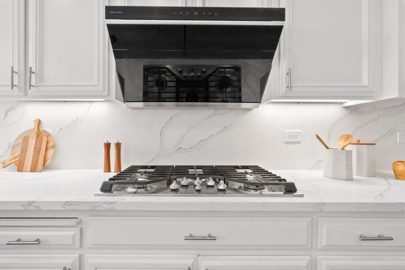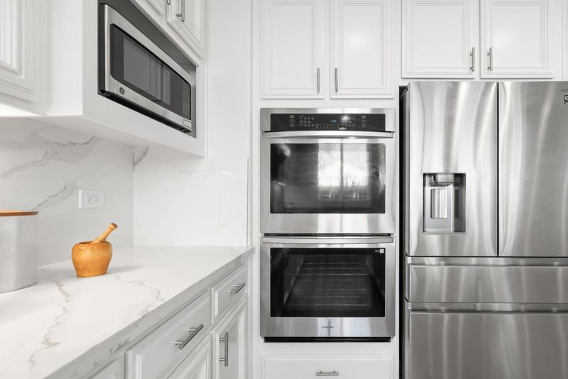 - Cooktop - Gas, Countertop - Quartz, Dishwasher, Exhaust Fan, Hookups - Gas, Island, Microwave, Oven - Built-In, Oven - Double, Refrigerator, Wine Refrigerator