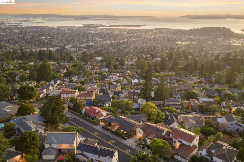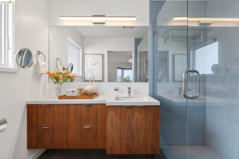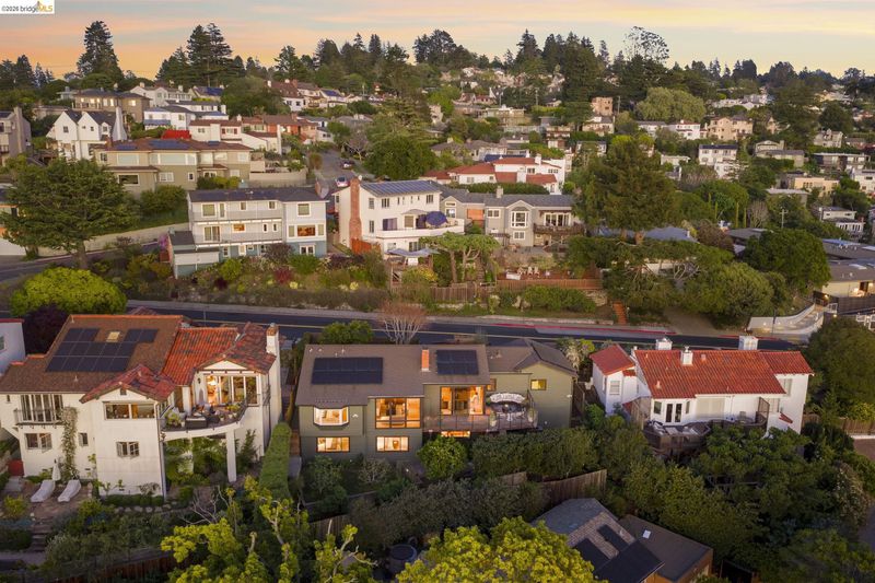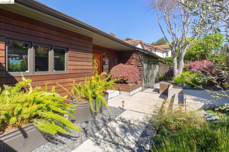 BESO score 10. This stylish MCM home is evolved for today's lifestyle and crowned by panoramic views of the Bay and Golden Gate Bridges, S.F. skyline, and the shimmering bay. Light, water, and sky draw you into this true sanctuary. Across two levels, the level-in entry, primary suite on the main floor, scale, and accessibility here is uncommon. Exotic hardwood cladding on the facade and wraparound deck complements the warm olive tones in a seamless theme. The open plan connects kitchen, dining, and living in a generous flow, each open to the views. Hardwood floors run into walls of glass, anchored by walnut cabinetry, a full Thermador suite, central island, and breakfast bar. The owner's suite has bay window views, large closet, and spa-level bath. Two more bedrooms and a marble-tiled bath complete the main floor. Downstairs are two bedrooms, lounge, wet bar, bath, laundry, loggia, and level backyard. A cutting garden, established fruit and other trees, level lawn and succulents compose a productive, low-maintenance landscape. Owned solar (8kW), dual Tesla Powerwalls, EV ready makes contemporary luxury living is effortless. With architectural integrity, multi-generation living options, future proof upgrades, this is simply a peerless lifestyle offering.