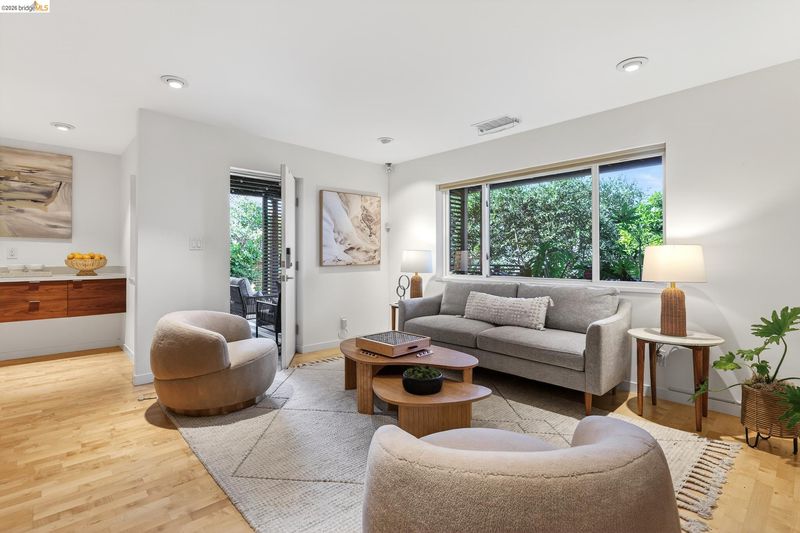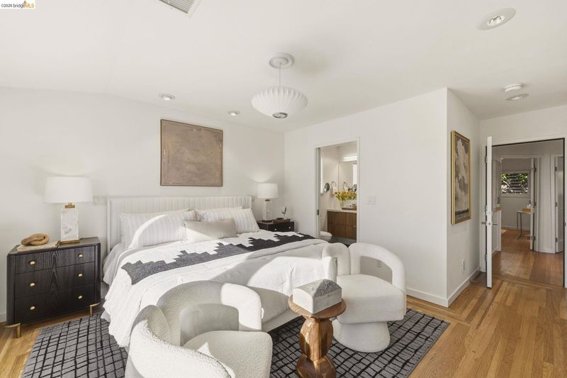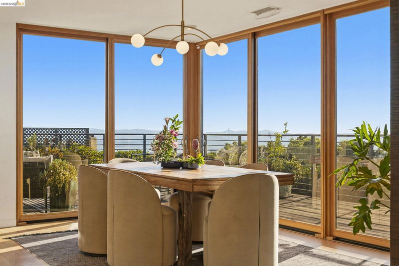 BESO score 10. This stylish MCM home is evolved for today's lifestyle and crowned by panoramic views of the Bay and Golden Gate Bridges, S.F. skyline, and the shimmering bay. Light, water, and sky draw you into this true sanctuary. Across two levels, the level-in entry, primary suite on the main floor, scale, and accessibility here is uncommon. Exotic hardwood cladding on the facade and wraparound deck complements the warm olive tones in a seamless theme. The open plan connects kitchen, dining, and living in a generous flow, each open to the views. Hardwood floors run into walls of glass, anchored by walnut cabinetry, a full Thermador suite, central island, and breakfast bar. The owner's suite has bay window views, large closet, and spa-level bath. Two more bedrooms and a marble-tiled bath complete the main floor. Downstairs are two bedrooms, lounge, wet bar, bath, laundry, loggia, and level backyard.