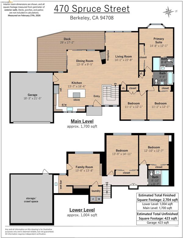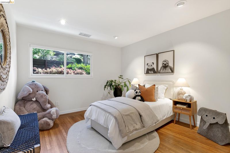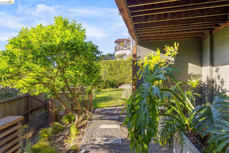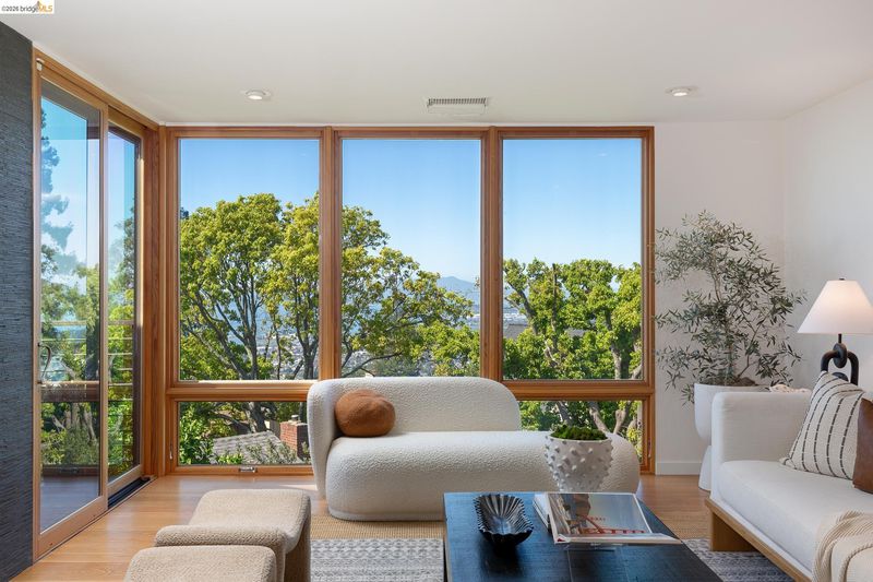 BESO score 10. This stylish MCM home is evolved for today's lifestyle and crowned by panoramic views of the Bay and Golden Gate Bridges, S.F. skyline, and the shimmering bay. Light, water, and sky draw you into this true sanctuary. Across two levels, the level-in entry, primary suite on the main floor, scale, and accessibility here is uncommon. Exotic hardwood cladding on the facade and wraparound deck complements the warm olive tones in a seamless theme. The open plan connects kitchen, dining, and living in a generous flow, each open to the views. Hardwood floors run into walls of glass, anchored by walnut cabinetry, a full Thermador suite, central island, and breakfast bar. The owner's suite has bay window views, large closet, and spa-level bath. Two more bedrooms and a marble-tiled bath complete the main floor. Downstairs are two bedrooms, lounge, wet bar, bath, laundry, loggia, and level backyard. A cutting garden, established fruit and other trees, level lawn and succulents compose a productive, low-main
