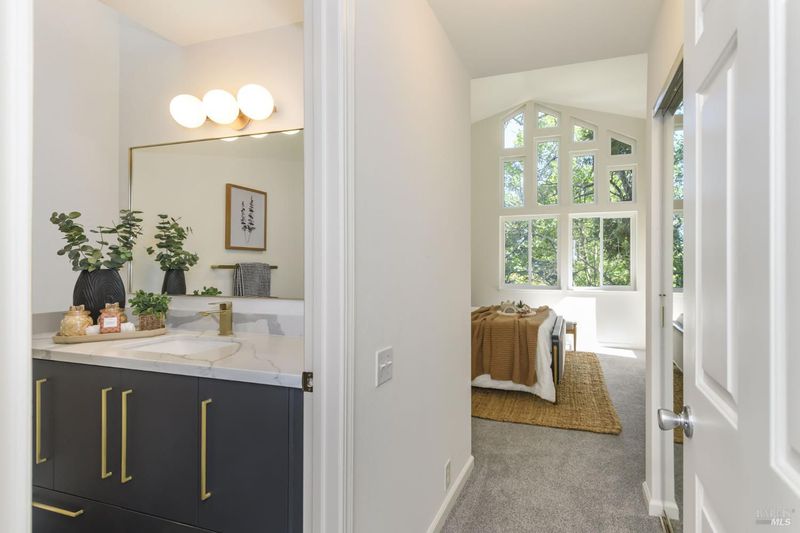 Bright, top-level 2-bedroom, 2-bath condo in Meadowcreek Station, beautifully remodeled in 2024. This inviting home features soaring cathedral ceilings in both the living room and primary bedroom, creating a light and airy atmosphere. The fully renovated bathrooms showcase stylish, spa-like finishes, while the updated kitchen offers newly painted cabinetry, new hardware and quartz countertops. Additional upgrades include Milgard dual-pane windows, newer carpet, and a newer HVAC system with updated ducting. A wonderful opportunity to own a thoughtfully updated condo in a desirable community.