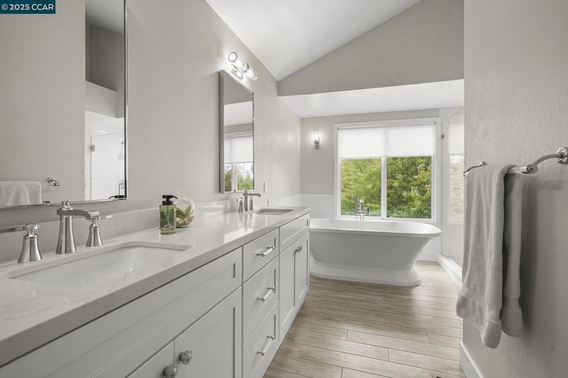 - Shower Over Tub, Skylight(s), Solid Surface, Tile, Double Vanity, Window