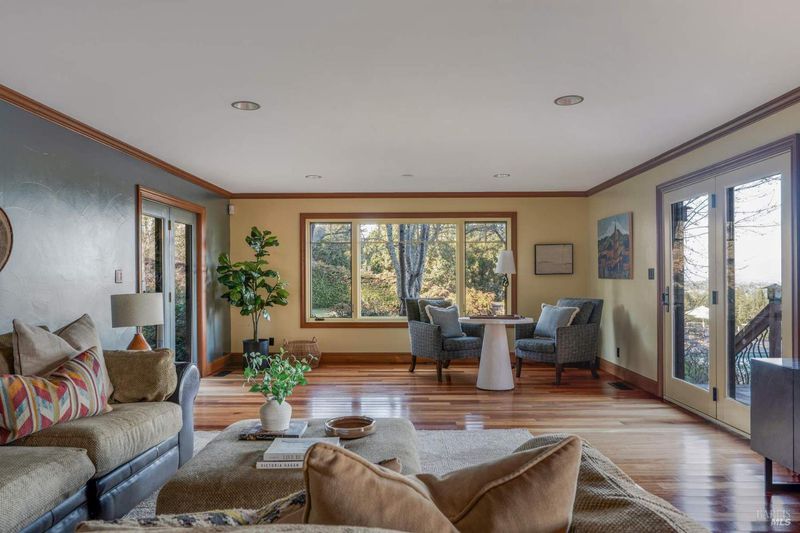 11799 Barnett Valley Road a private, resort‑style estate tucked down a long gated drive in pastoral West Sonoma County. Perched for panoramic views of Mt. St. Helena and the Mayacamas, this craftsman residence and companion buildings deliver an effortless indoor‑outdoor lifestyle where every day feels like a getaway. The main home is luxuriously finished with warm cherry floors that glow in the afternoon light, three inviting fireplaces, and a dramatic telescoping wall of glass with an electric screen that opens the great room to sweeping valley views and balmy evenings. A whole‑home smart system keeps lighting, climate and media at your fingertips so entertaining is seamless and relaxation is uninterrupted. Main‑level living is gracious and intimate, with a serene ensuite bedroom, a generous family room/den, and a view‑centric great room that naturally draws everyone together. Upstairs the expansive primary suite reads like a private retreat a quiet sitting area, a sunlit viewing deck for morning coffee, an elegant bath, and a tucked‑away office for inspired work. Another spacious bedroom suite offers flexible space for a kids' lounge, media room, or guest hideaway. Outside, the estate is a sun‑lit lawn made for lingering: a sparkling pool and spa for lazy afternoons, a convenient pool bath, and a fully outfitted alfresco kitchen where long dinners and laughter flow easily beneath the stars. Broad decks invite barefoot mornings, cocktail hours, and slow sunset conversations. A lavender‑lined path leads to a light‑filled studio cottage with a full bath and a charming guest house with a covered deck perfect for quiet mornings, writers' retreats, or late‑night stargazing. A whimsical detached office adds creative charm and practical workspace. Set behind a long, gated drive, with sweeping mountain vistas and thoughtfully curated outdoor rooms, 11799 Barnett Valley Road feels like your private escape an endlessly inviting sanctuary where getaways become unnecessary and every season feels like a celebration