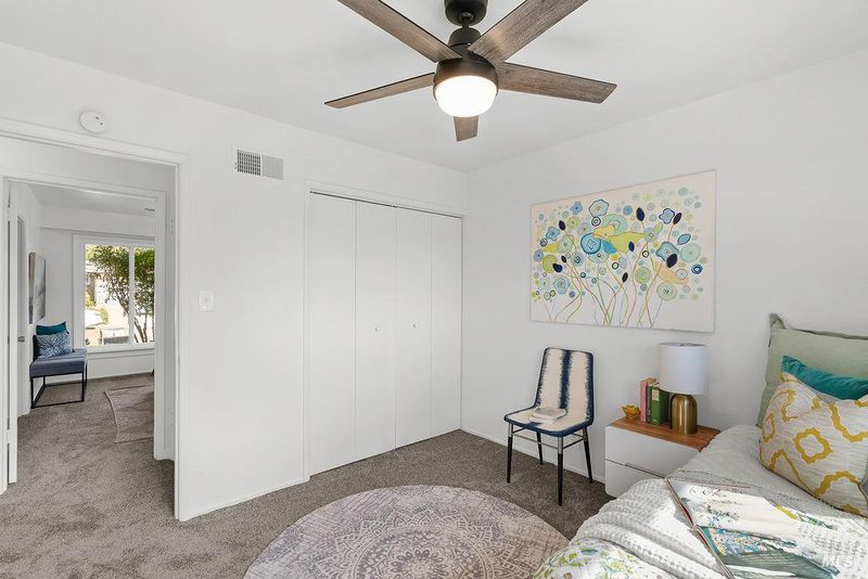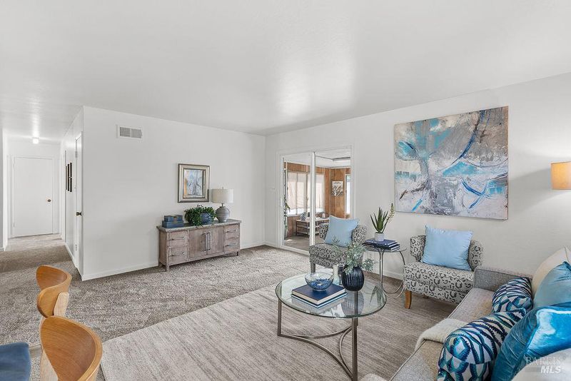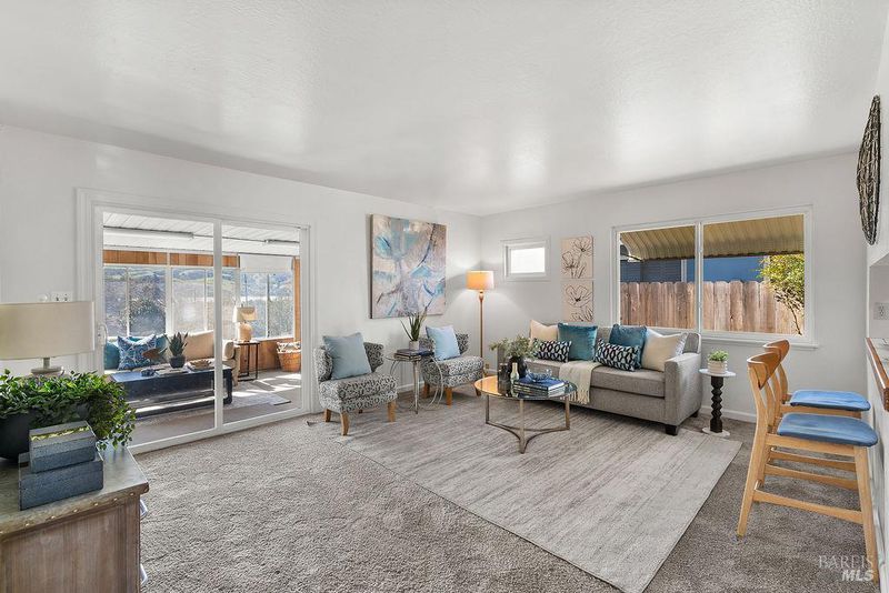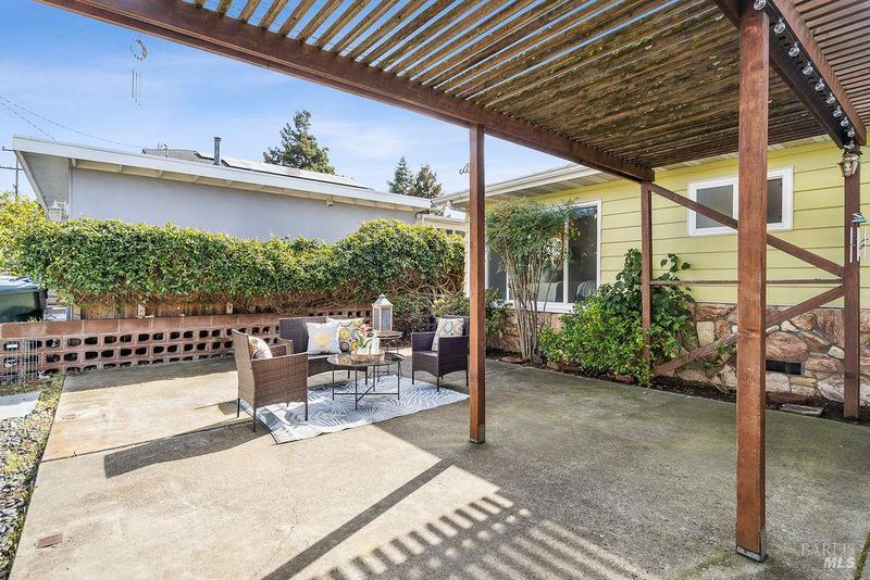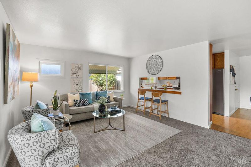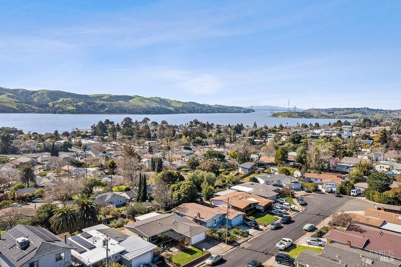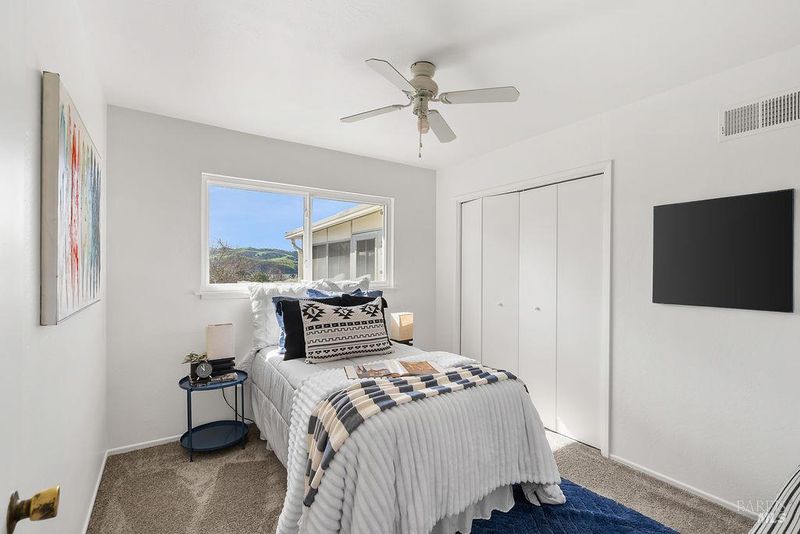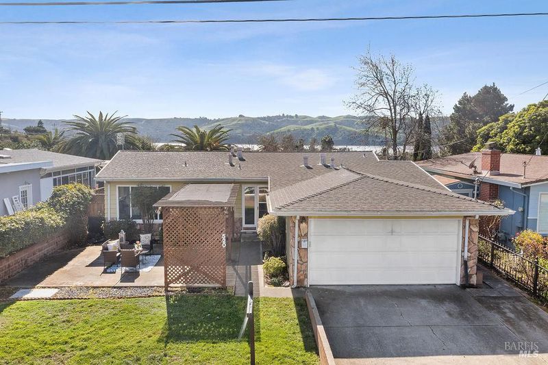 Adorable 3-bedroom, 1-bath home in the desirable Rolling Hills subdivision the perfect starter home for first-time buyers! Fresh interior paint, new carpet, and an updated HVAC system make this home truly move-in ready. The spacious living room features updated windows and opens to a bright sunroom filled with natural light from surrounding windows. Complete with a pellet stove and a peek-a-boo view of the bay, this inviting space is perfect for relaxing year-round. The galley kitchen was updated several years ago and offers stainless steel appliances, laminate flooring, tile countertops, and a convenient eat-in bar top. All three bedrooms are generously sized and feature ceiling fans and updated windows. The bathroom has been refreshed with an updated vanity, quartz countertops, and tile flooring. Outside, enjoy a charming front courtyard with a pergola, while the backyard features a cement patio and a small water view perfect for relaxing or entertaining. Conveniently located near downtown Benicia, 9th Street Park, Benicia High School, and Mary Farmar Elementary School.